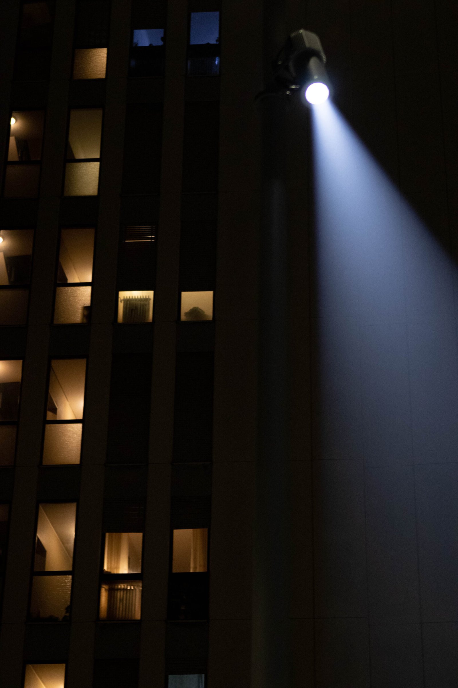Non dormire circoscrive una porzione di spazio urbano vuota e pone attenzione sugli immaginari personali e collettivi a esso riconducibili, decostruendo tutte quelle forme di controllo, targeting e potere che sono proprie dell’illuminare. Sgambaro lascia che quella porzione di spazio possa essere abitata e riempita a nostra discrezione: l’opera diviene dunque uno strumento attraverso cui rileggere lo spazio urbano e collettivo, il nostro rapporto con esso, le dinamiche che condizionano la nostra società e il nostro saper stare con noi stessi.
